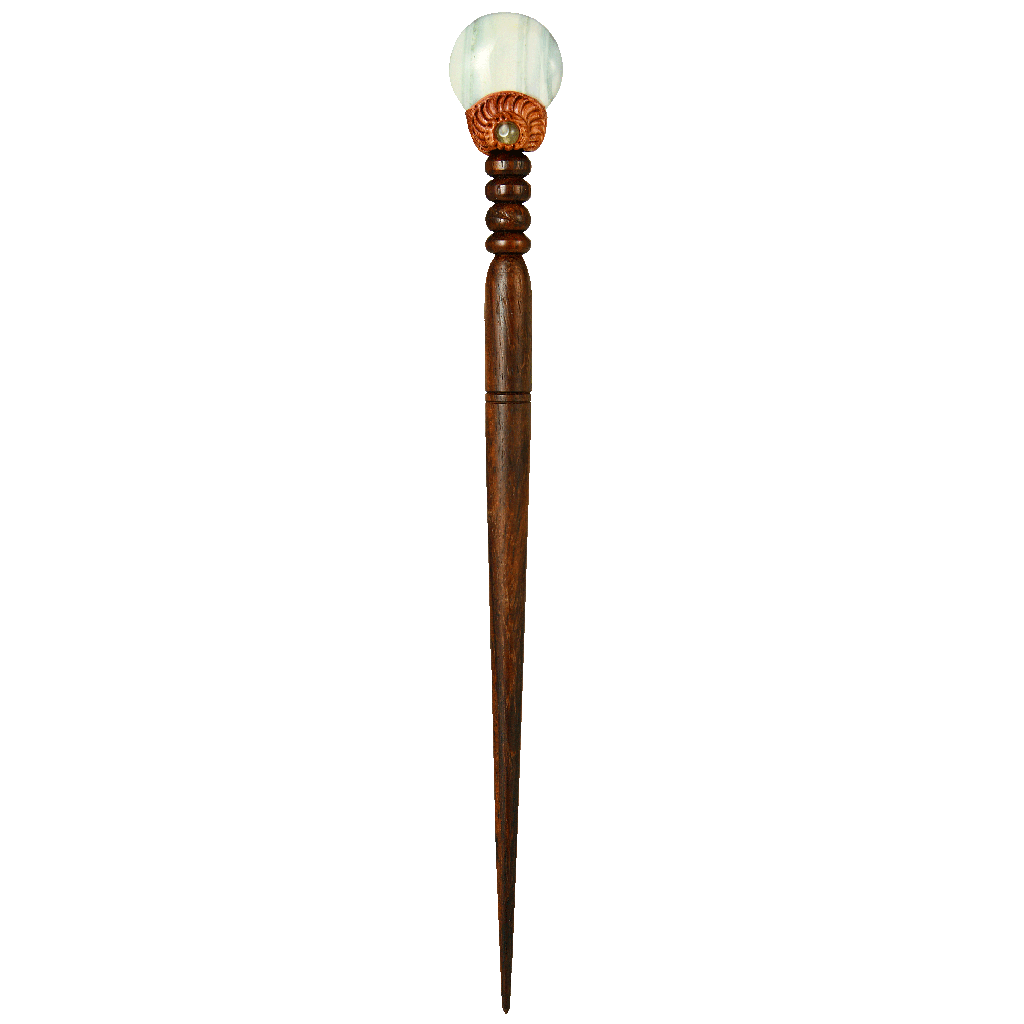 Эта шпилька из дерева акации с пейзажной яшмой — больше, чем аксессуар. Она словно сохраняет в себе дыхание земли и напоминает о внутреннем равновесии, где бы ты ни была.