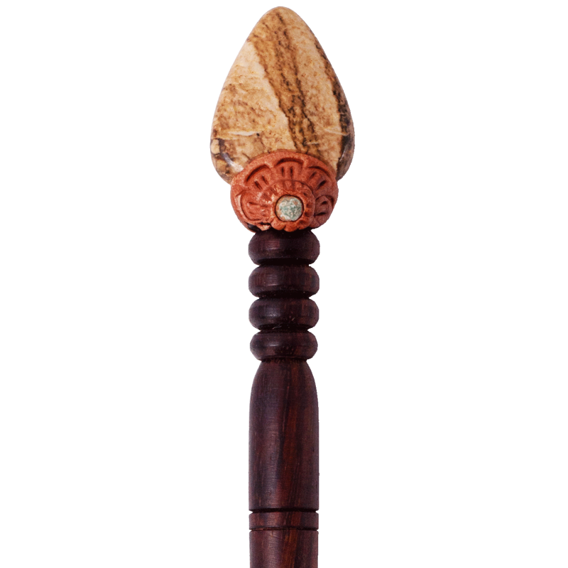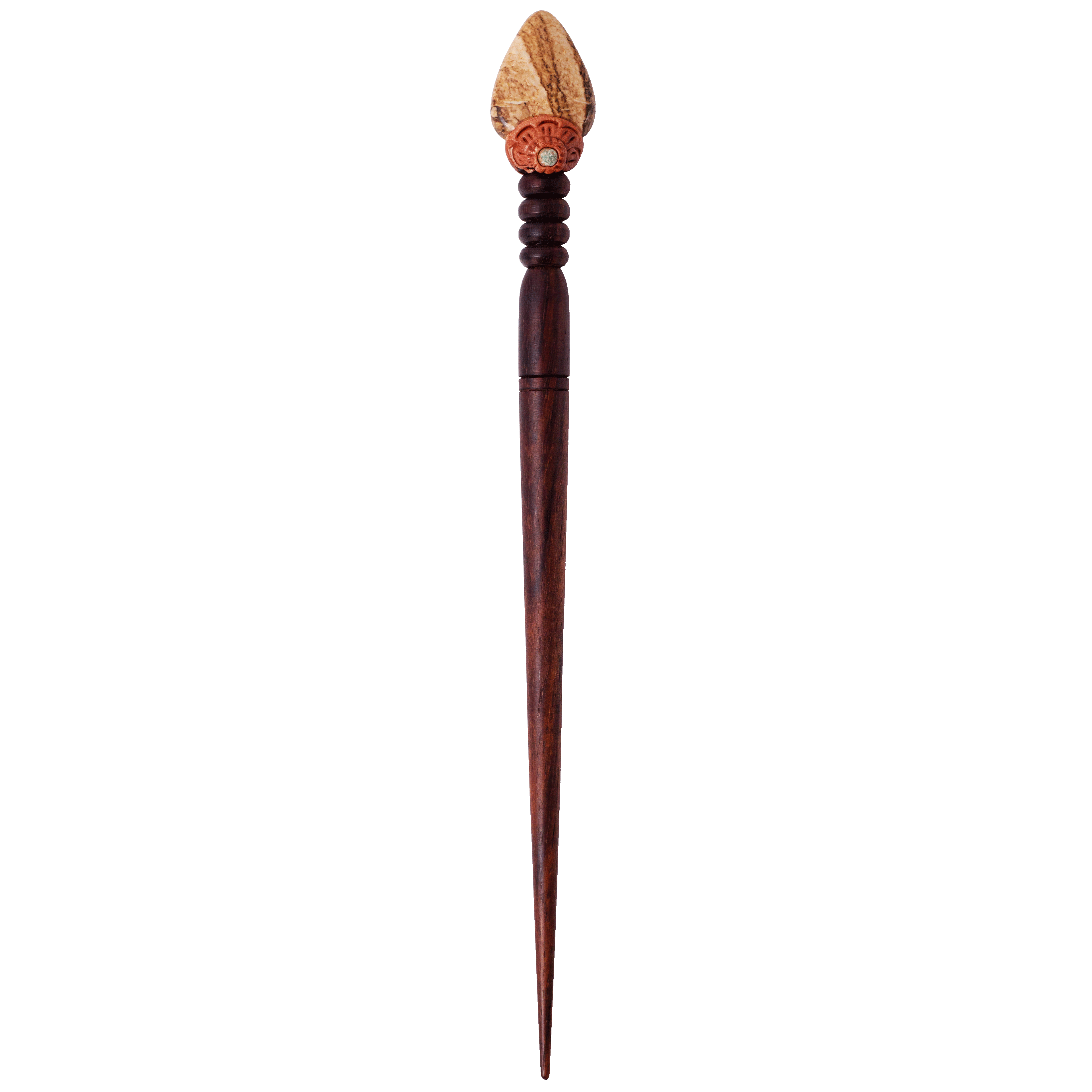 Эта шпилька из дерева акации с пейзажной яшмой — больше, чем аксессуар. Она словно сохраняет в себе дыхание земли и напоминает о внутреннем равновесии, где бы ты ни была.